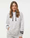 J America Ladies 7.25 Ounce Melangé Fleece Scuba Hood. 7.25 ounce 60/40% Cotton/ Polyester Melange fleece. Scuba hood, contrast drawcords, front pouch pockets. Rib waist & cuffs. Ships from Fowlerville, MI.